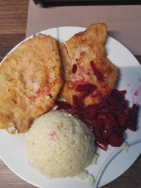 Obrátené rezne, ryža, miešaný šalát. Perník ku kávičke.