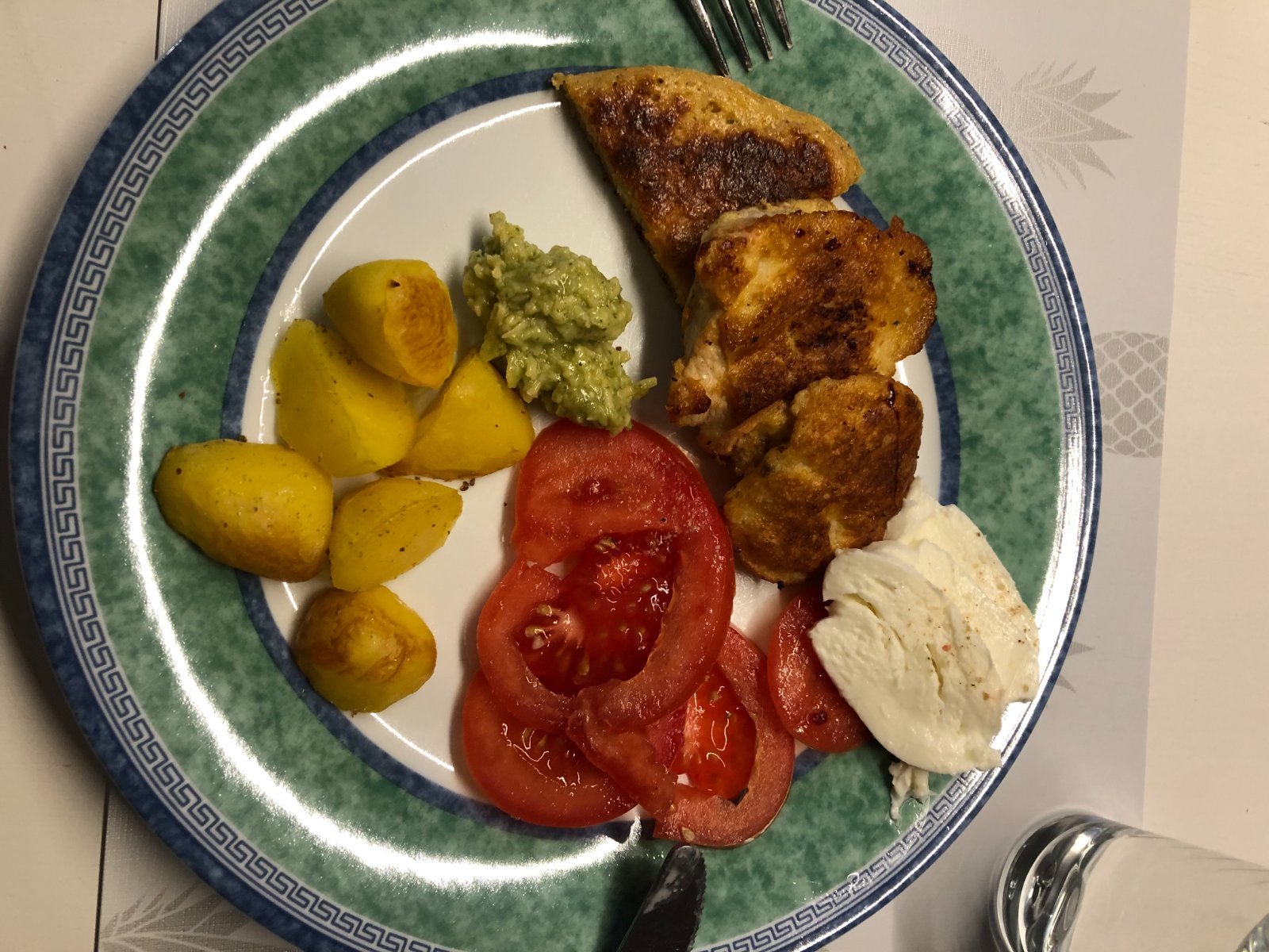 Kurací vývar, vyprážané morčacie rezne, varené zemiaky a miešaný šalát.