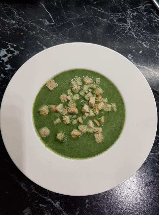 Krémová brokolicová polievka so smotanou , plnená paprika s paradajkovou omáčkou a domácou kvaskovou knedľou