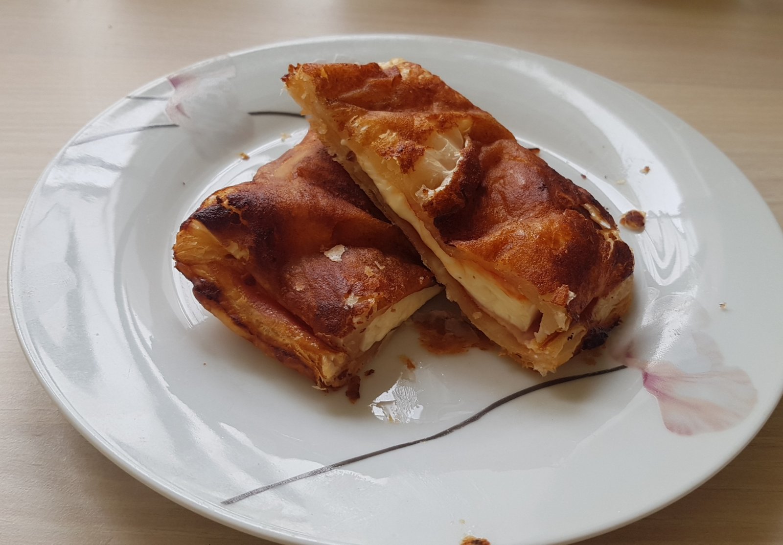 Camermbert a šunka + syr zapečené v lístkovom ceste k tomu ľadový šalát