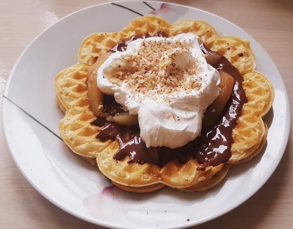 Wafle 🥞 s hruškovým džemom, čokoládou, hruškami🍐a šľahačkou, posypané orechami