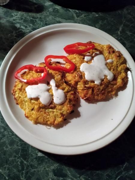 Večera: cuketovo pšenové placky poliate kyslou smotanou s korenim tzatziki