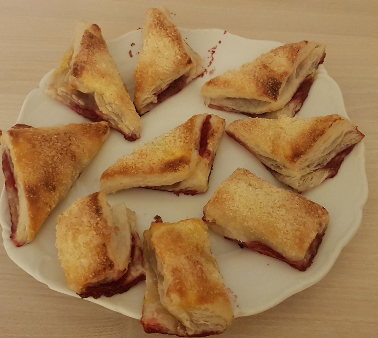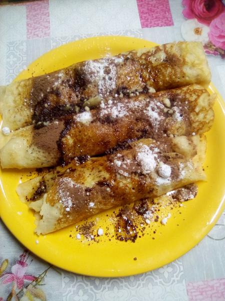 Palacinky s tvarohom zmiešaným ríbezľovým lekvárom , deťom a manželovi vyprážaný syr a zemiaky v trúbe ,plus polievku so suchého hrachu s klobásou .