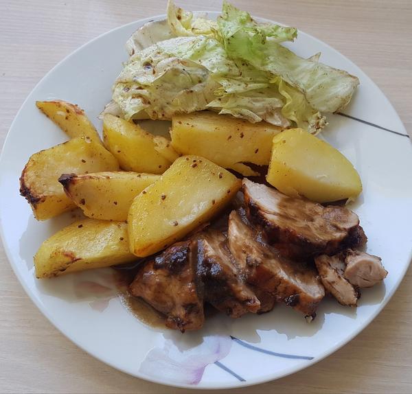 Dnes pečená bravčová panenka s marinádou k tomu opekané zemiaky a ľadový šalát