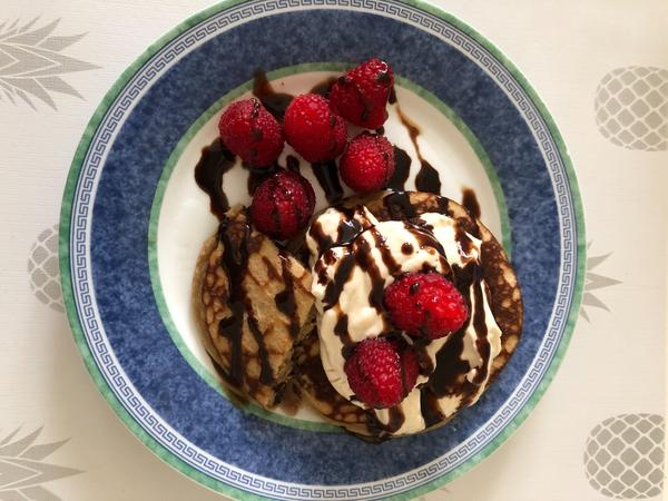 Taka lahsia vecera pre deti, americke palacinky s jogurtom a malinami, poliate cokoladou