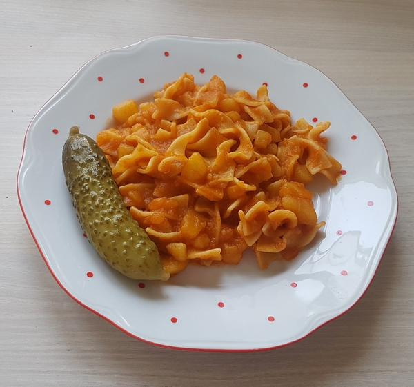 Včera bol teplý cestovinový šalát a zeleninová polievka (tá bude aj dnes), dnes budú pečené kuracie stehná s kyslou kapustou a ryžou 🙂