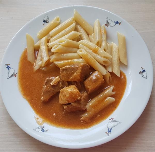 Dnes penne,korenene kuracie prsia a nivova omacka