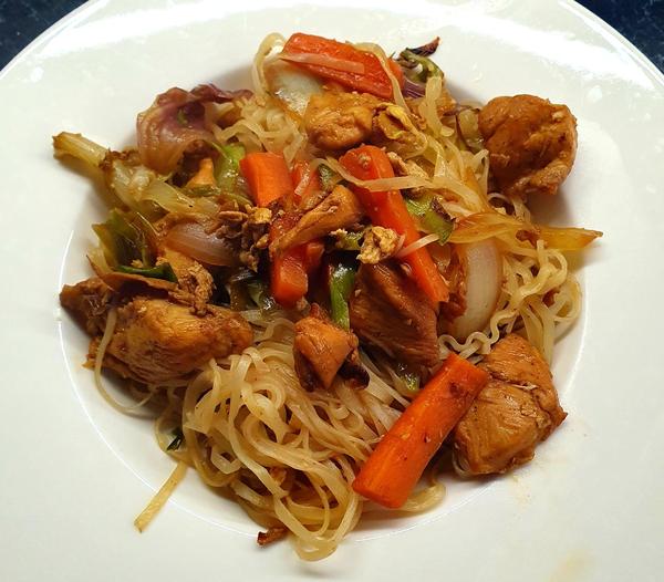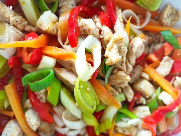 Dojedame... ja pecene maso, cervenu kapustu a knedlu, dcera kuracie chilli con carne s ryzou a chalanom robim kuraci rezen v cesticku, zemiakovu kasu a uhorkovy salat.