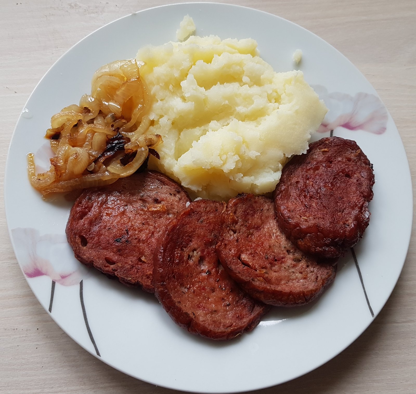 Včera zemiakové placky s čalamádou a dnes sekaná so zemiakovou kašou a skaramelizovanou cibuľkou