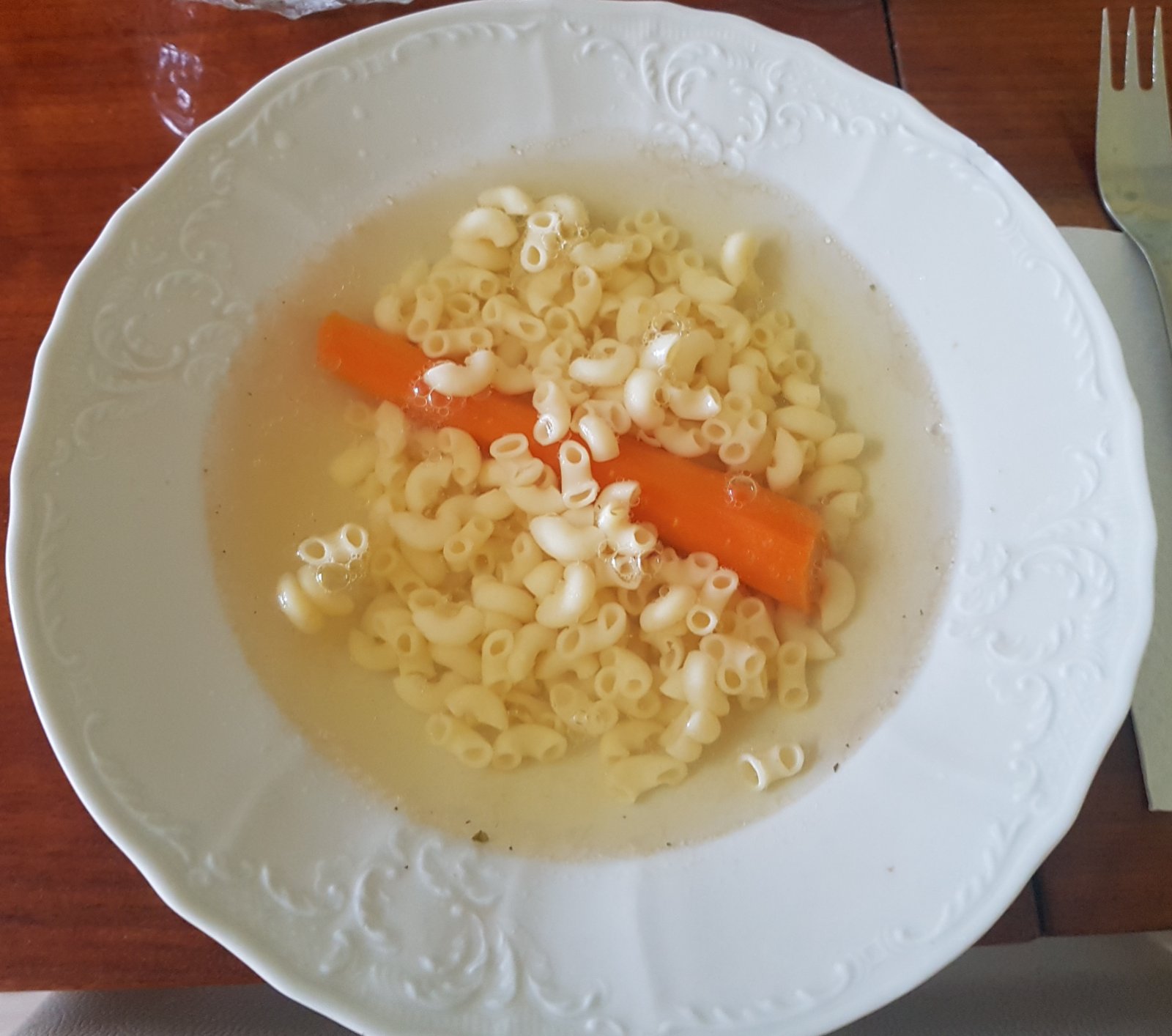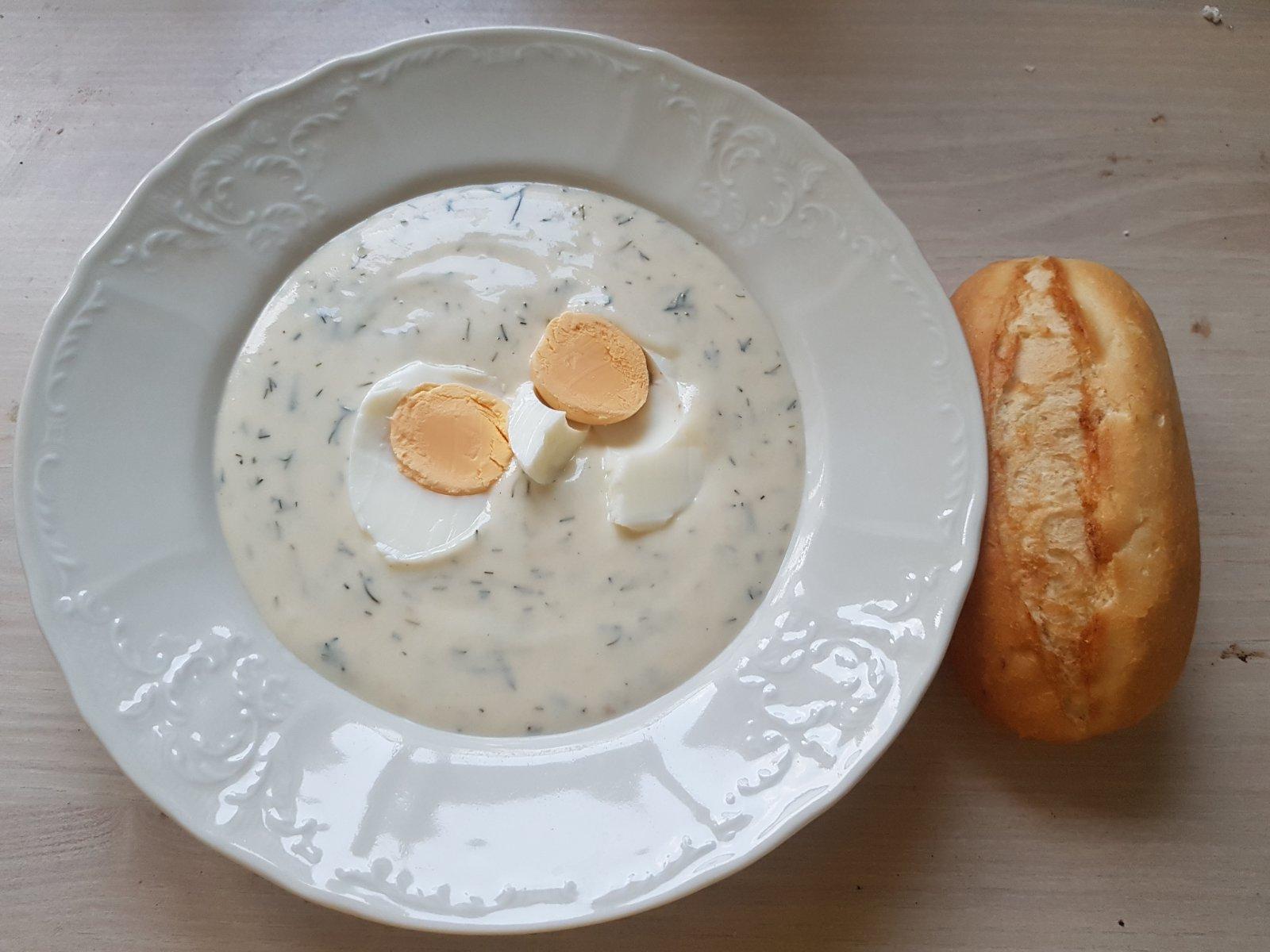 V salke som zmiesala trochu vody a zemiakovy skrob, vliala za staleho miesania. To polievka chyti tu mazlavu konzistenciu. V salke som rozhabarkovala este vajicko a na konci vliala zasa za staleho miesania.