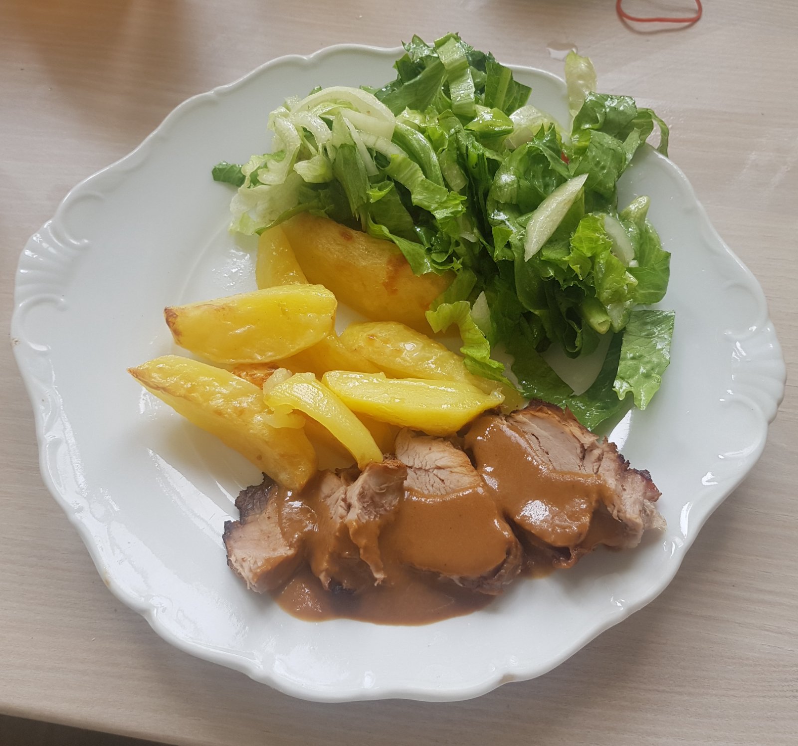 Panenka so zeleninovou omáčkou s červeným vínom - panenku som nakrájala na medailónky asi 1 cm široké, naolejovala z každej strany a opiekla som každý kúsok na rozpálenej panvici z oboch strán, asi tak minutu. Mäso som dala nabok. do panvice na výpek som dala nakrájanú cibuľu, na drobno nakrájanú mrkvu, petržlen a zeler, posypala jemne múkou a nechala orestovať. Pridala som kvalitné suché červené víno ( Primitivo) asi deci , balzamikový ocot, trochu worcestrovej omáčky, smotanu na šľahanie a máličko trstinového cukru, osolila, okorenila, Keď začala zmes vrieť, vložila som naspäť maso aj so šťavou, ktorú pustilo a nechala ešte 5 minut prevrieť.
