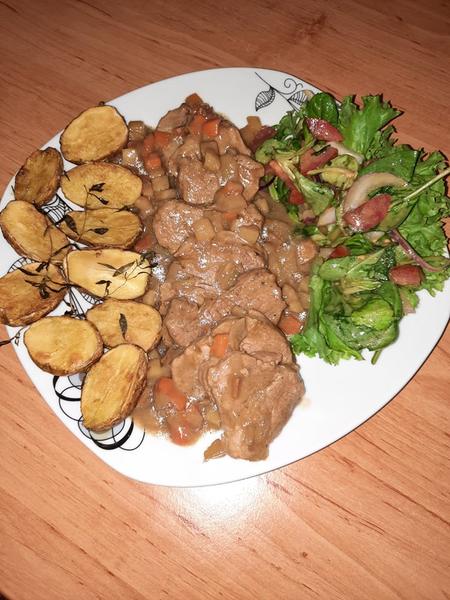 Panenka so zeleninovou omáčkou s červeným vínom - panenku som nakrájala na medailónky asi 1 cm široké, naolejovala z každej strany a opiekla som každý kúsok na rozpálenej panvici z oboch strán, asi tak minutu. Mäso som dala nabok. do panvice na výpek som dala nakrájanú cibuľu, na drobno nakrájanú mrkvu, petržlen a zeler, posypala jemne múkou a nechala orestovať. Pridala som kvalitné suché červené víno ( Primitivo) asi deci , balzamikový ocot, trochu worcestrovej omáčky, smotanu na šľahanie a máličko trstinového cukru, osolila, okorenila, Keď začala zmes vrieť, vložila som naspäť maso aj so šťavou, ktorú pustilo a nechala ešte 5 minut prevrieť.