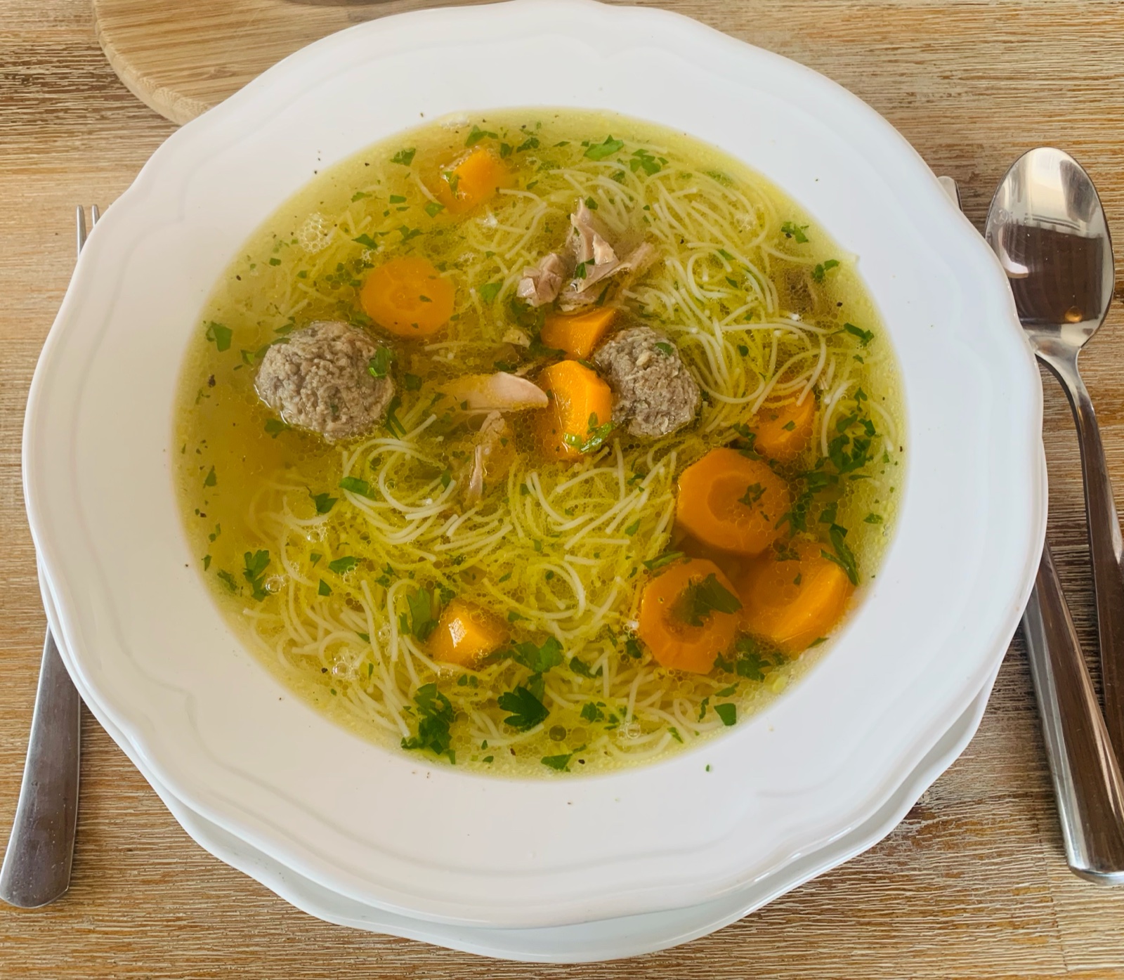 Dnes obed na etapy 🤔 5- krát nám vypadla elektina kvôli búrke 🤪. Ale podarilo sa nakoniec: vývar s domácou zeleninou, fašírky a nové zemiaky s tzatziky.