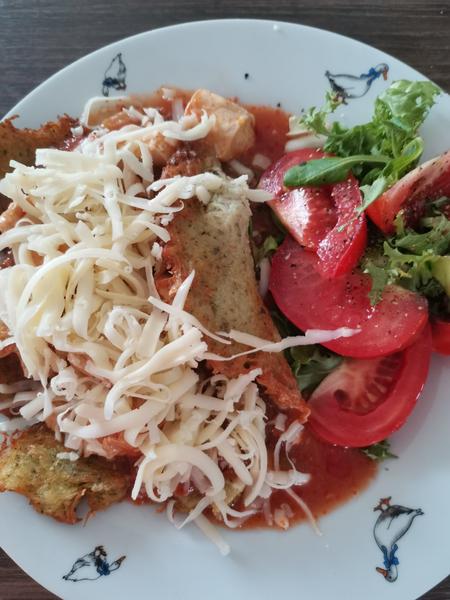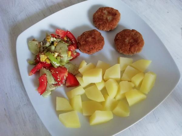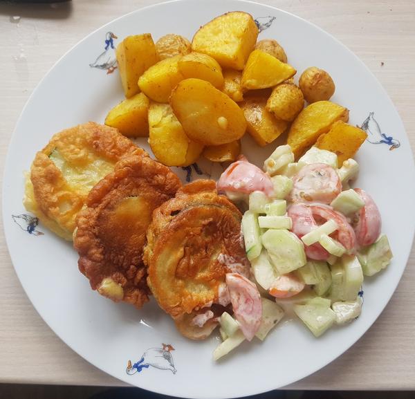 Dnes obed z našej záhrady: cuketa v cestíčku, americké zemiaky, miešaný šalát...