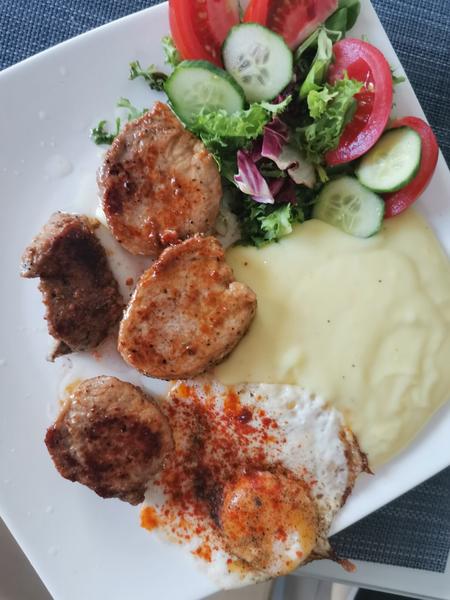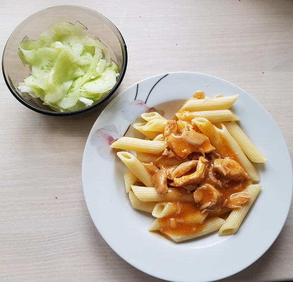Predvčerom vývar z kuraťa, perkelt s cestovinou a uhorkovým šalátom...