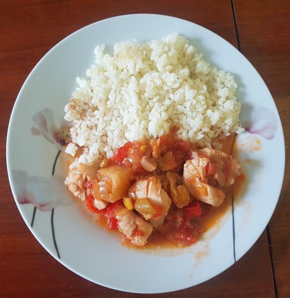Vývar, kuracie prsia v domácej Uncle Bens omáčke s ryžou a cuketový koláčik (moje predsudky voči koláču, v ktorom sa nachádza cuketa boli, na nešťastie neopodstatnené 😆... žiaľ, na posedenie som zjedla už tri kúsky 🙄)