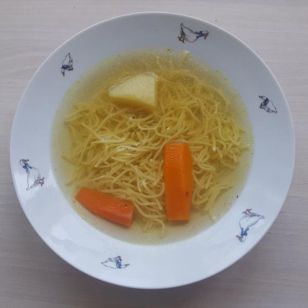 Jedna polievka od včera fazuľová , druhá párková a pečené krídla s ryžou .