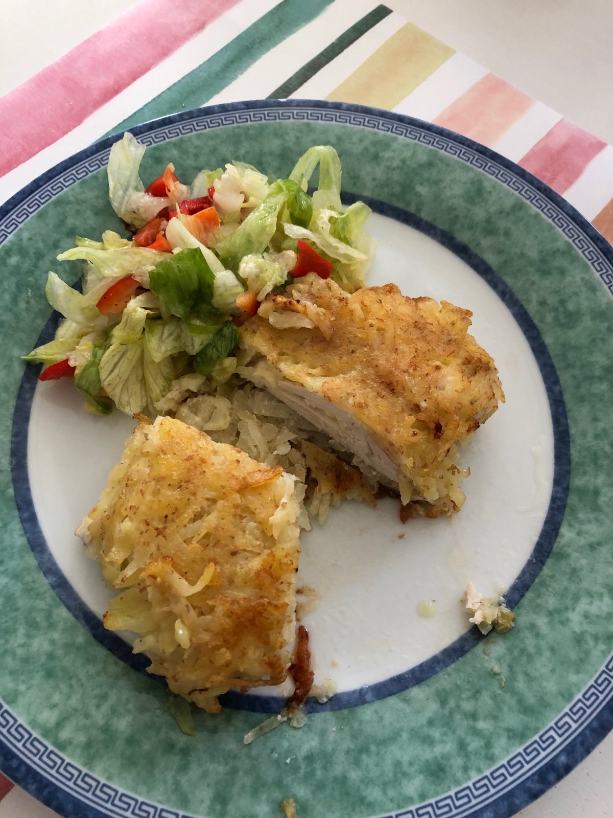 Kuracie v jogurtovo-cesnakovom cestíčku, zemiakové pyré, rajcinovo cibuľovy šalát.