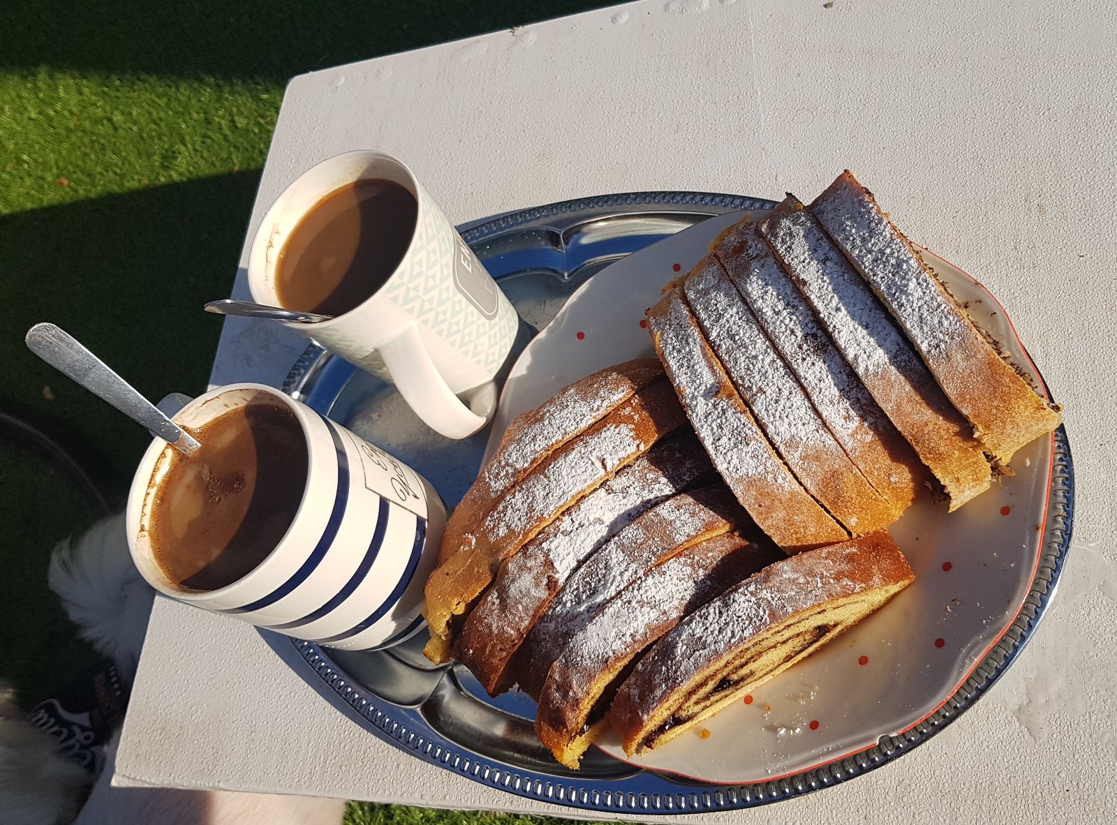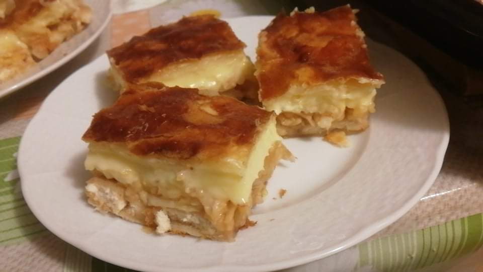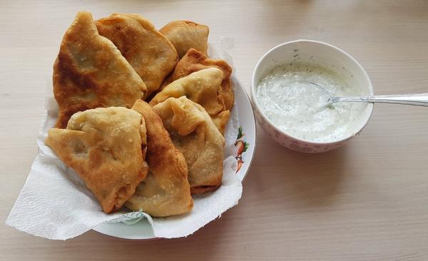 Samosy 🥟 s jogurtovo-bylinkovým dresingom a jablkový koláč s posýpkou 🍎🥧