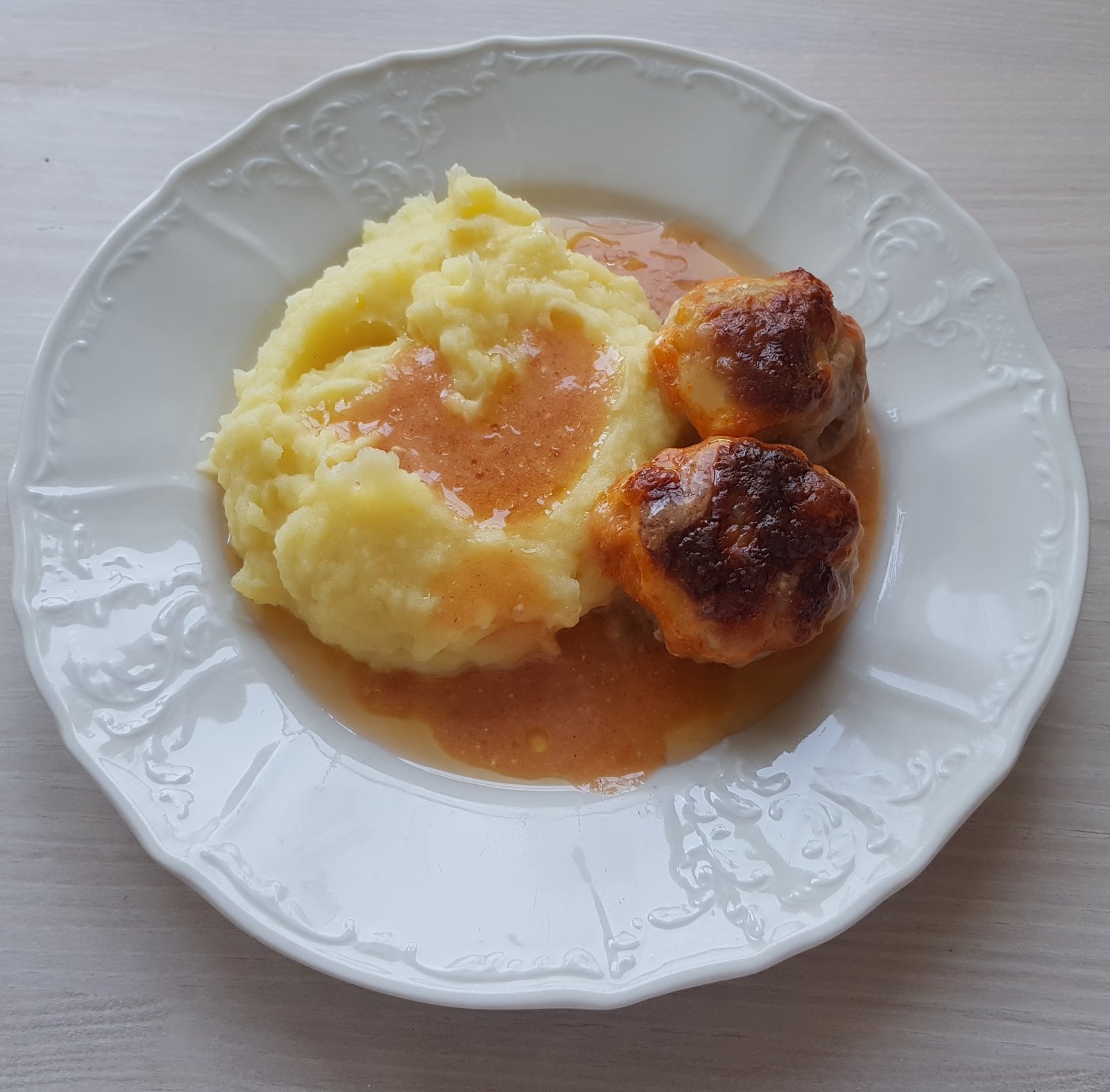 Vývar s haluškami, zapekané guľky Toscana so zemiakovou kašou a punčová torta