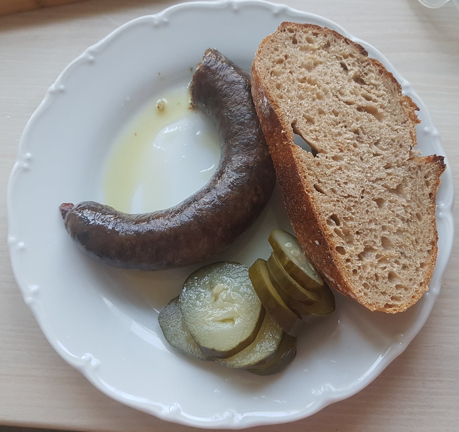 Pečené hurky (jaternice) s kyslou uhorkou a kváskovým chlebom