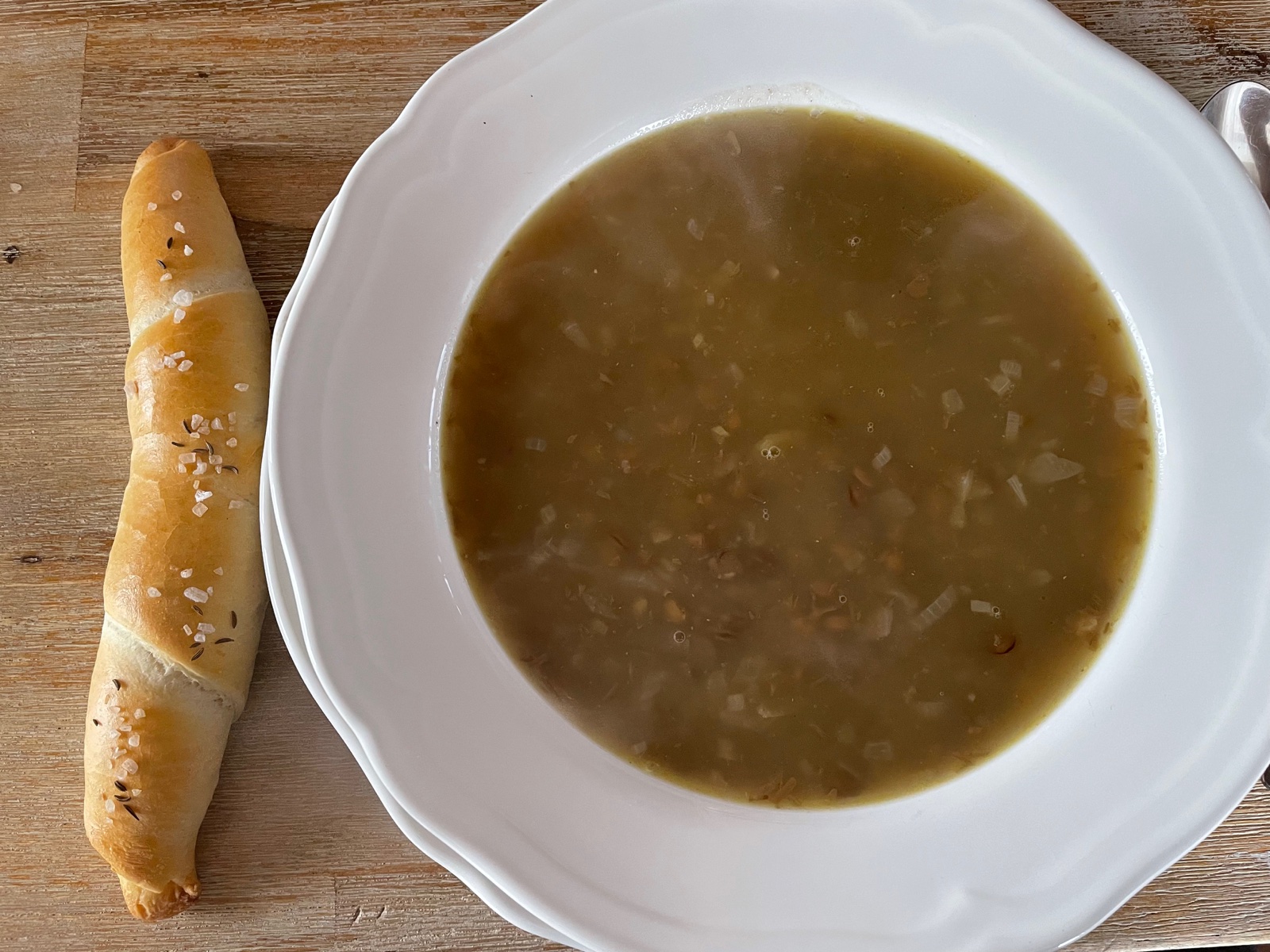 Karfiolová polievka s guličkami a bravčové mäso na šťave s ryžou k tomu kyslé uhorky.