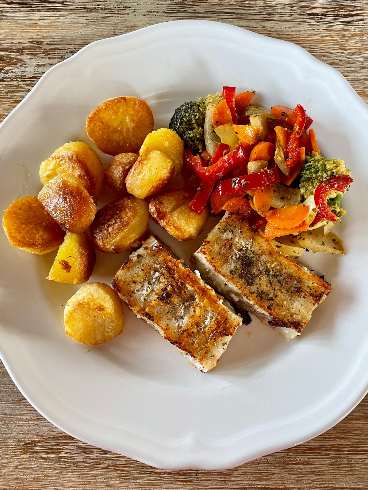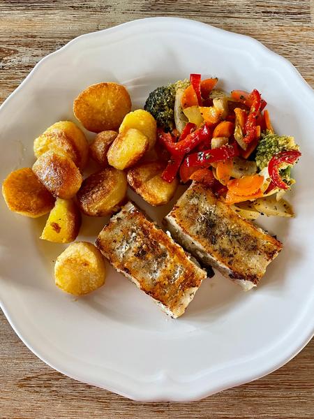 Treska s chrumkavymi zemiakmi a gril.zeleninou