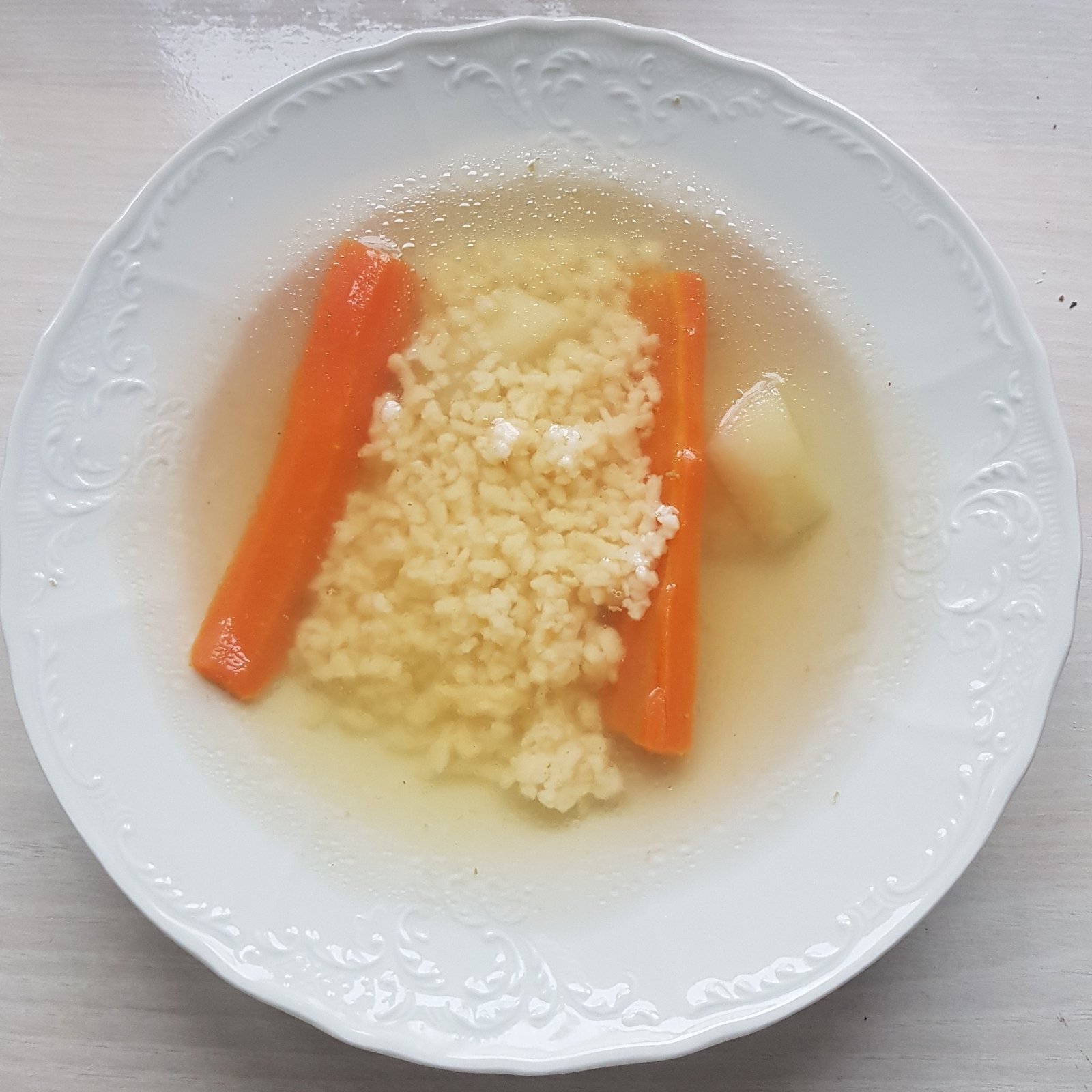 Vývar hovädzí s krupicovymi haluskami orestovanou mrkvou. Čína pikantná s ryžou...