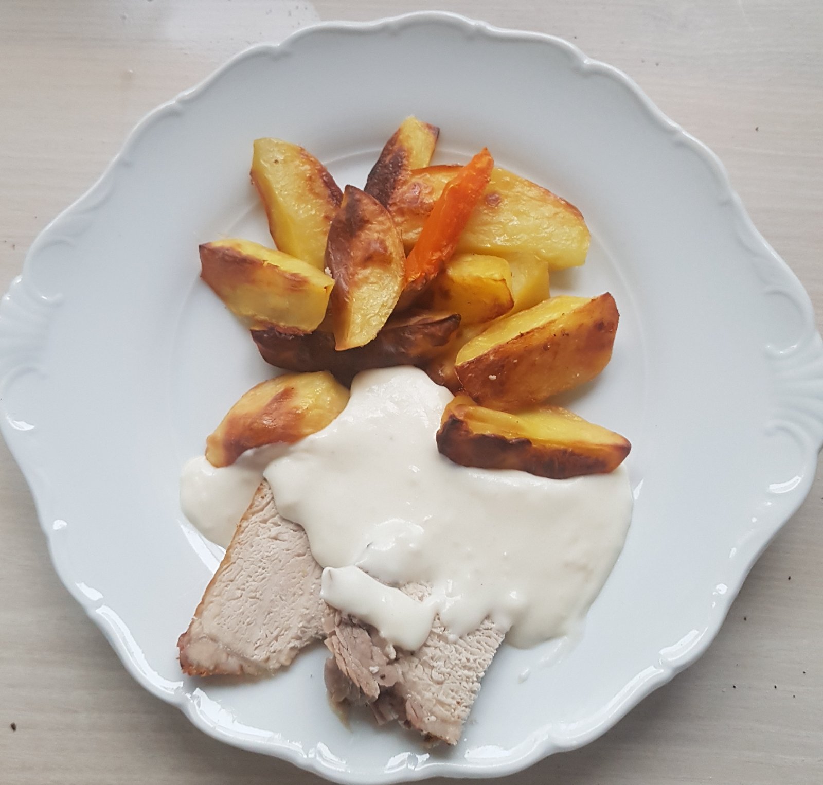 Vývar s domácou mrveničkou, pečené karé s chrenovou omáčkou (chren z našej záhradky) s opekanými zemiakmi a sladká bodka: pomarančovo-kávové guľky "čo dom dal" a cuketový perník...