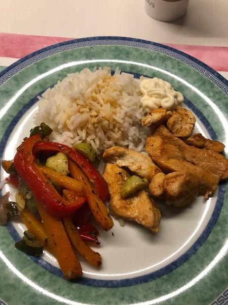 Dnes sote z kuracieho mäsa, ryža, hranolky. Polievka vývar. Keďže nedeľa, aj dezert bude, tvaroh s piškótami a ovocím, jednoduché a chutné, syn sa nevie toho dojest