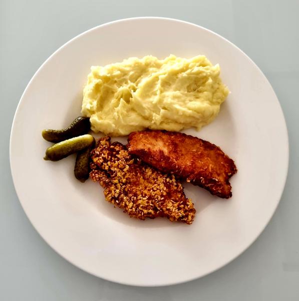 my este dojedáme z nedele fašírka so zemiakovou kašou, hlavkový šalát, slepačia polievka