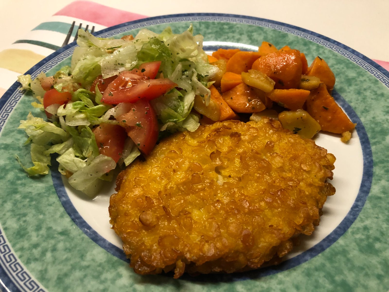 bravčový vývar s krúpami, kelovo-zemiakový prívarok, faširka a kúsok chlebika