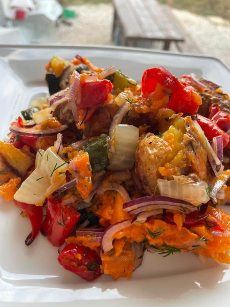 @malinovka333 zemiaky som uvarila v šupke, následne sa môžu prekrojiť, ja som ich popučila pohárom, hodila na plech pridala batat, cibuľu cuketu a papriku, skratka čo máme v chladničke, osolila poliala oliváčom a piekla som aby zmäkli bataty na 220, zemiaky som chcela aby boli chrumkavé na povrchu tak tie som po vyložení ostatnej zeleniny ešte dopiekla silnejšie na gril.. všetko dala do misy, pridala nakrajany kôpor, červenú cibuľu, ešte zakvapla olivovým neskoro mi napadlo aj trochu citrónová šťava by sa hodila a premiešala môže sa ešte dosoliť podľa potreby.. podávala som s cesnakovym dresingom, ja som robila dresing z pečeného cesnaku ale môže byt akýkoľvek.. ☺️ Ak bude chutiť a urobíte si, dajte vedieť, poteší ma ☺️