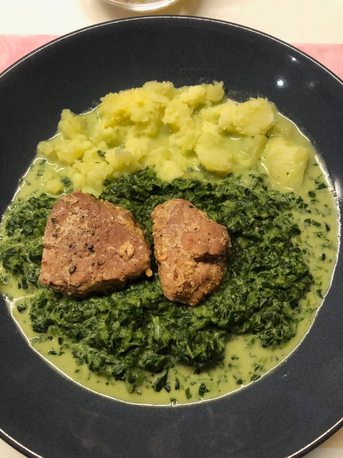 Špenát v kokosovom mlieku so zemiakmi a mäsom