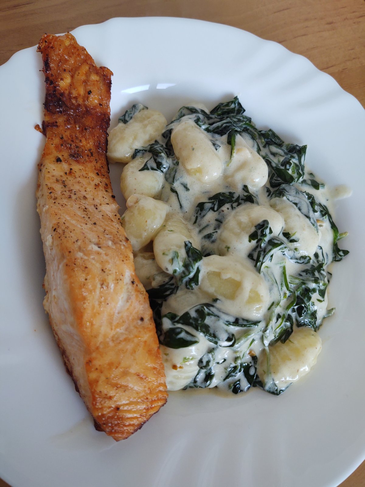 Nocky s baby spenatom v smotanovo-parmazanovej omacke s pecenym lososom.