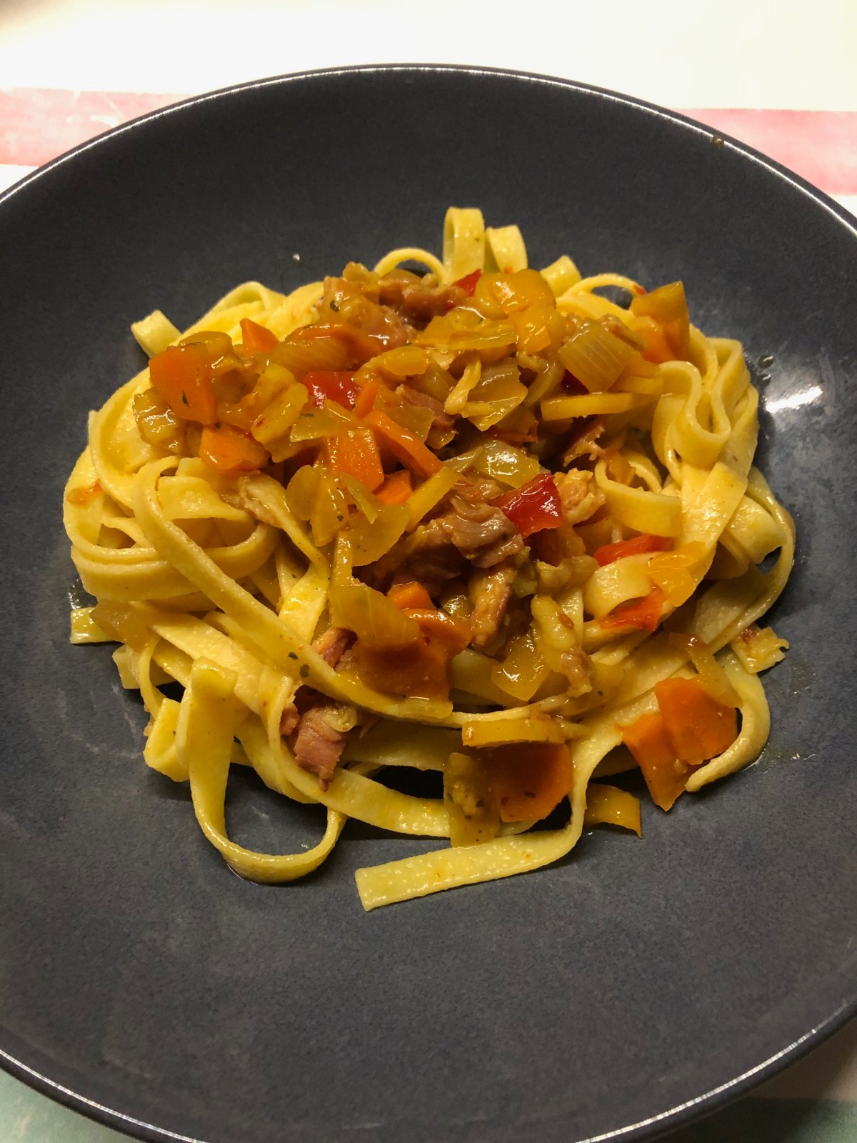 Fotky z poslednych par dni - palacinky s jogutom a ovocim; maso v currie omacke a ryza; cestoviny a k tomu bol uhorkovy salat