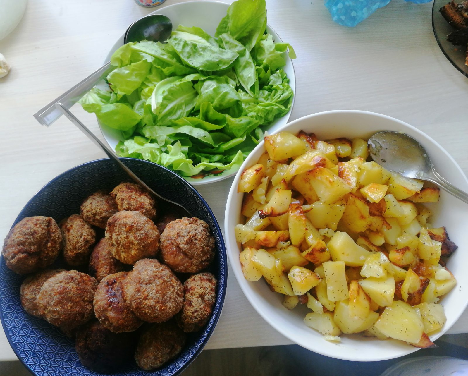 Včera sme boli na oslave, stoly sa od jedla prehýbali, kto by myslel, čo variť v nedeľu. Takže dnes narýchlo, z toho čo špajza dala, bezmäsité, ale zato fajné. Tuniakové fašírky, pyré, šalát.