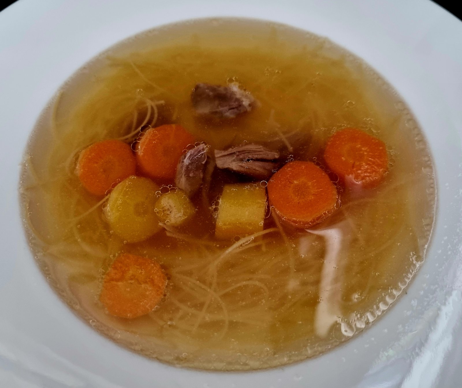 Vývar a cigánska s varenými zemiakmi... ku kávičke kokosové laskonky s čučoriedkovým krémom