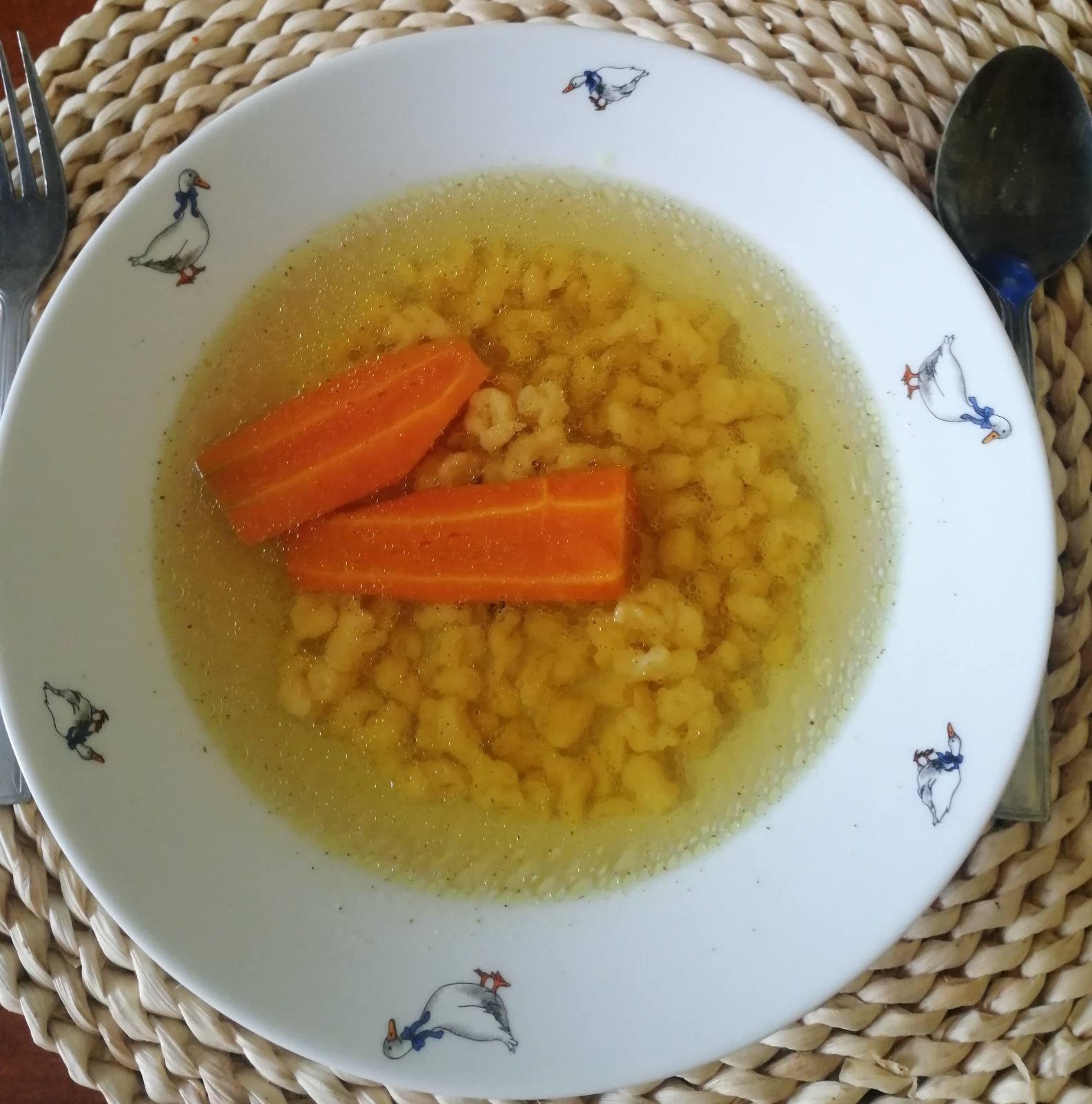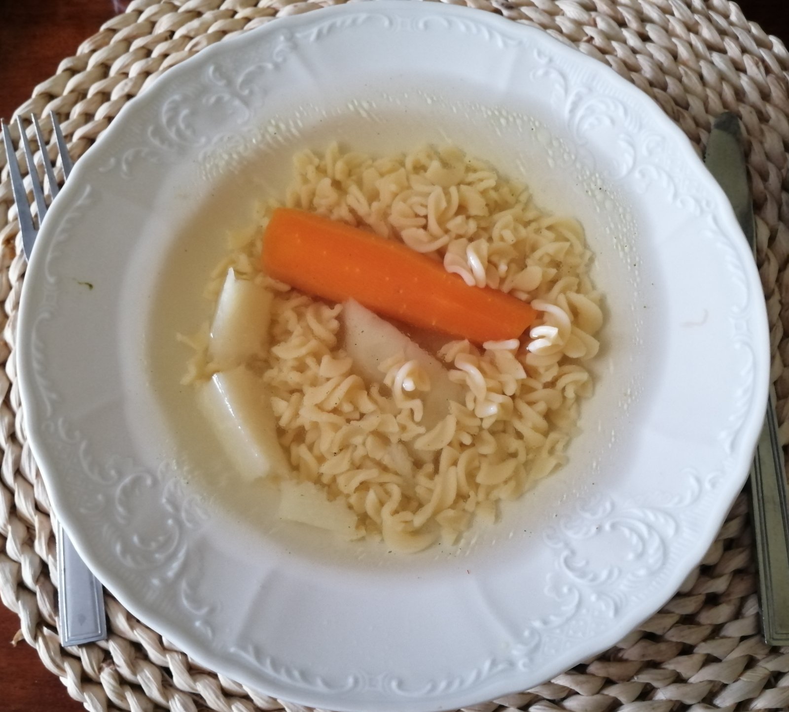 Hovädzí stroganov s tarhoňou, hovädzí vývar s cestovinou.