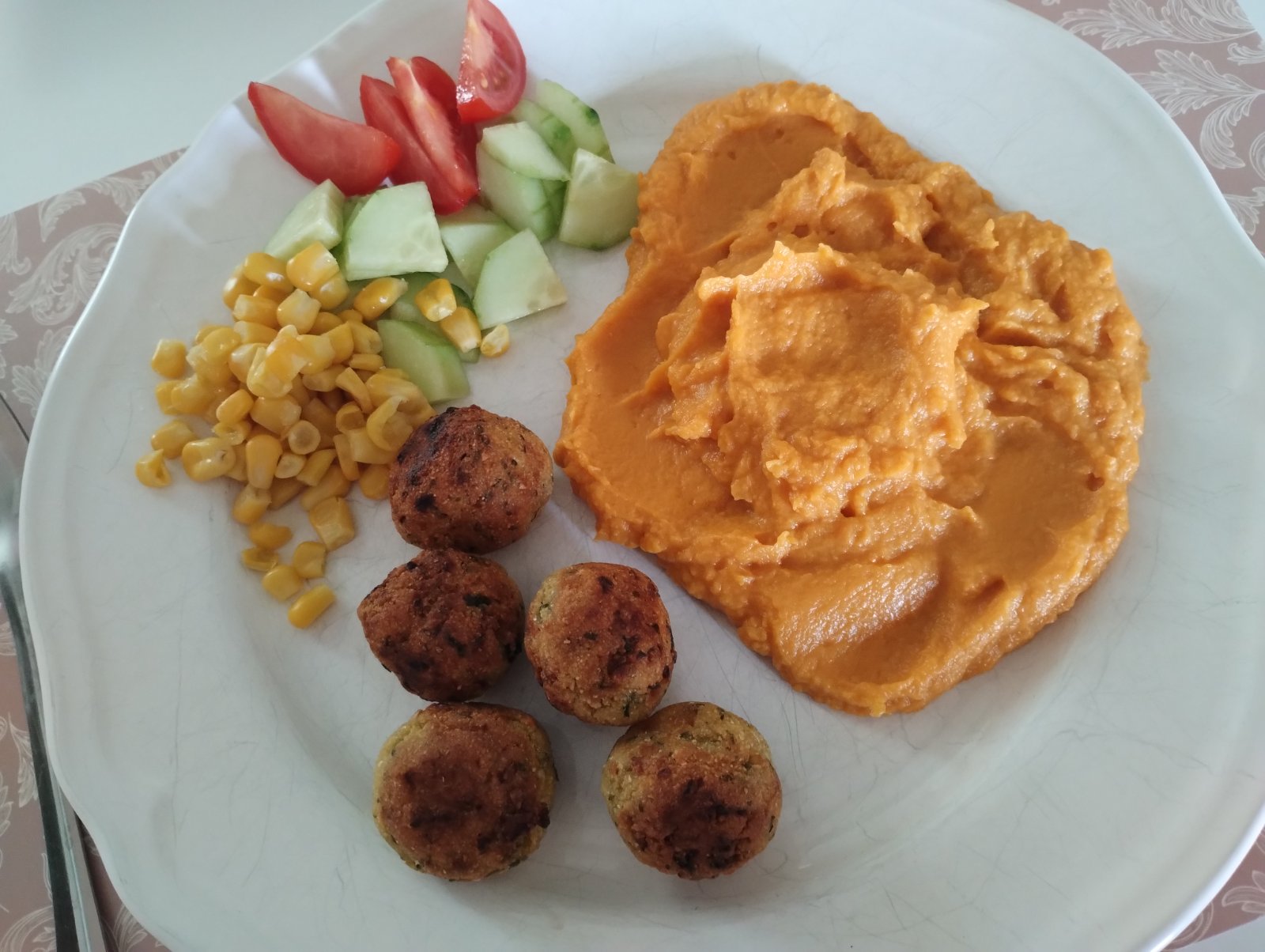 Falafel z DM , batátové pyré, zeleninová obloha.