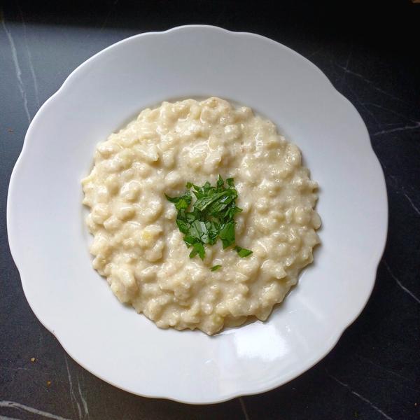 Smotanovo-zemiaková krémová polievka s medvedím cesnakom, halušky s bryndzou.
