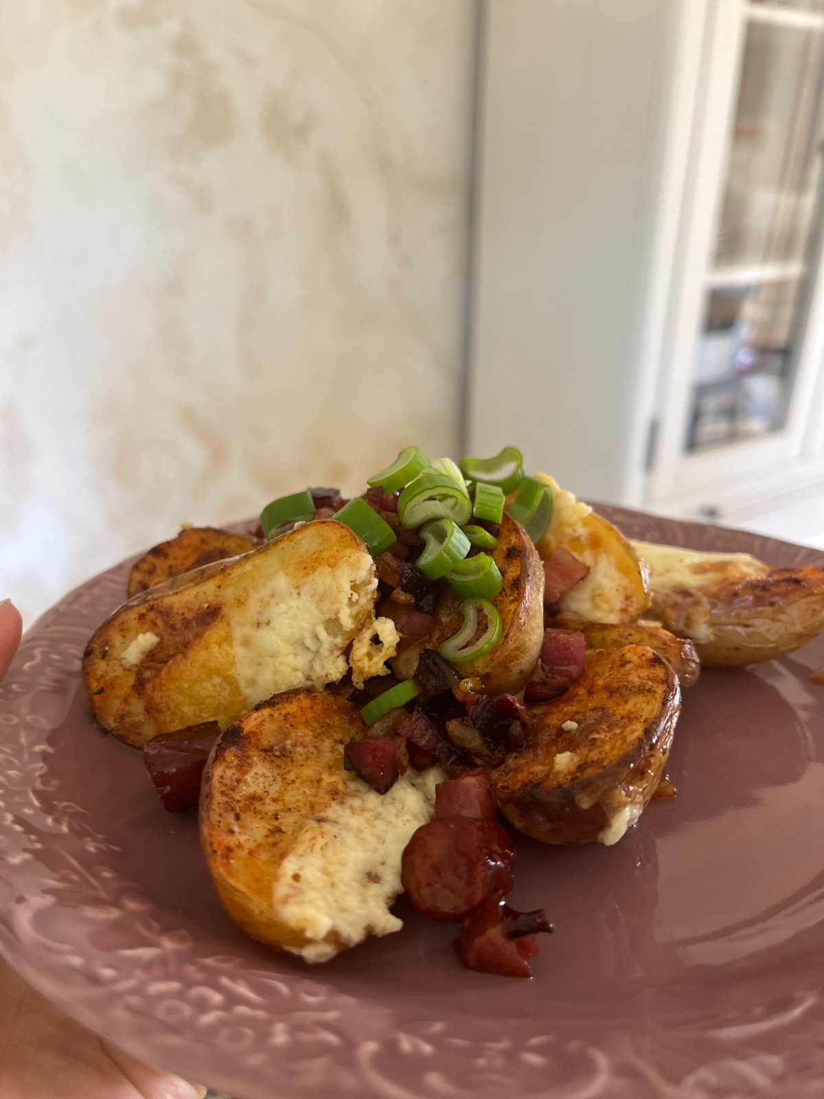 Nové zemiaky upečené v šupke s bryndzou, slaninkou, cibuľkou