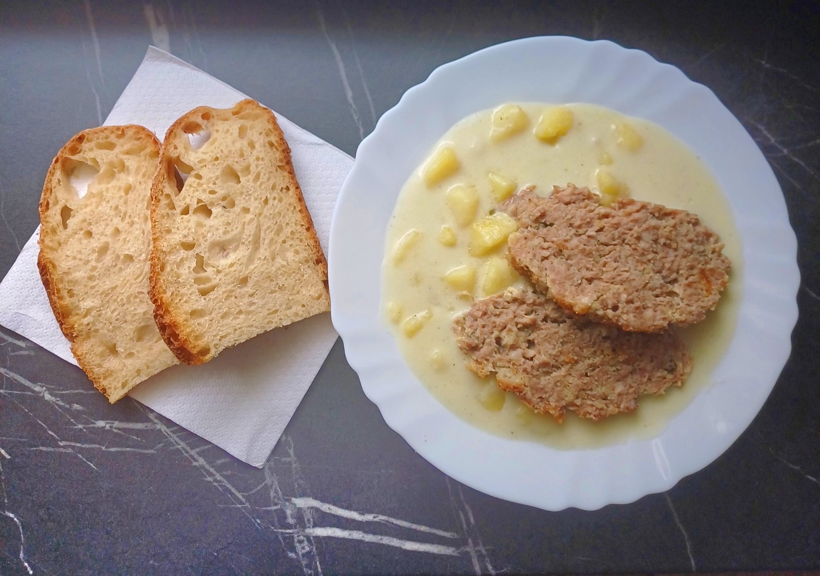 Zemiakový prívarok, fašírka, kváskový chlieb.