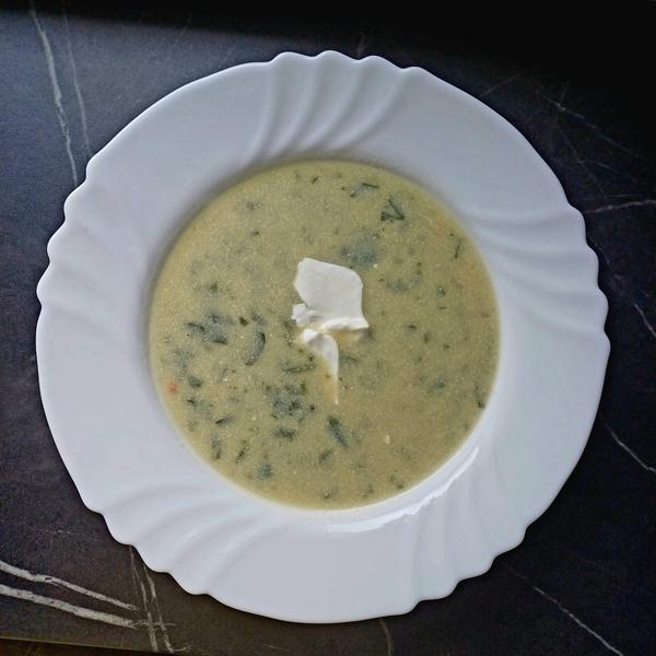 Smotanovo-zemiaková krémová polievka s medvedím cesnakom, halušky s bryndzou.