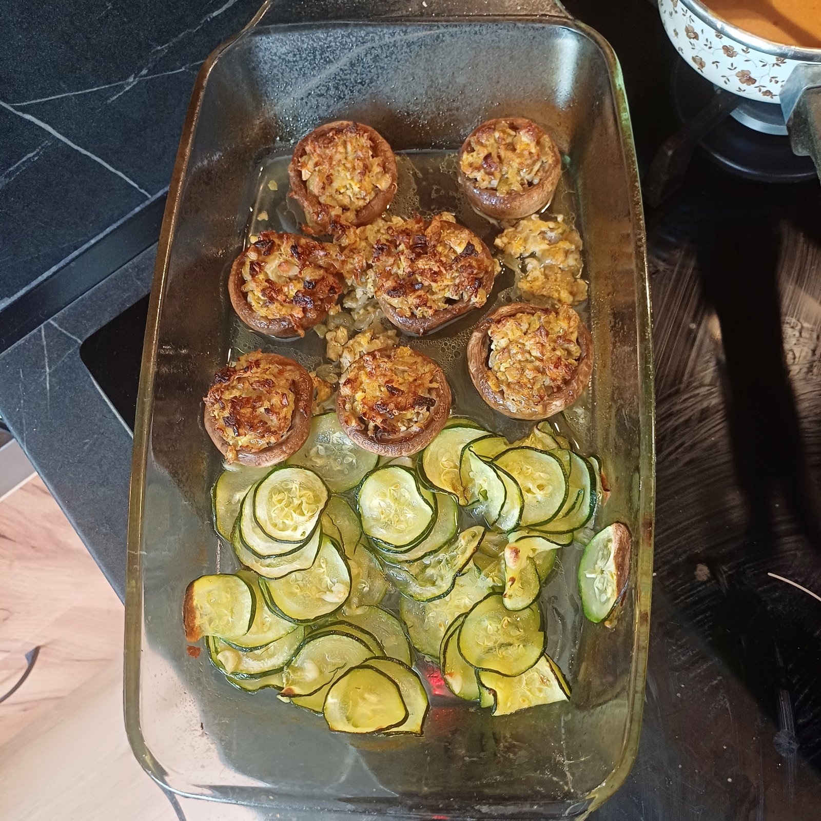Dnes opäť zeleninovo. Polievka plus opekané zemiačky, plnené a zapečené šampiňóny, cuketa, omáčka podľa chuti, táto bola z Ikey.