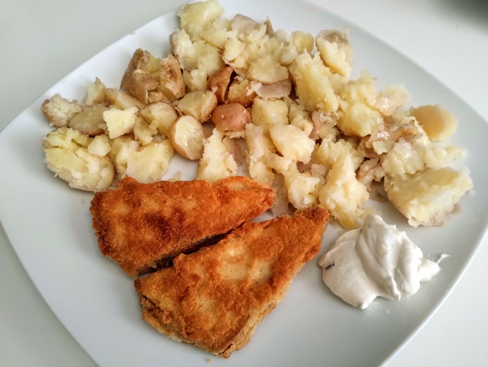Rybie filé v cestíčku, zemiaky, smotanovo-jogurtova omáčka.