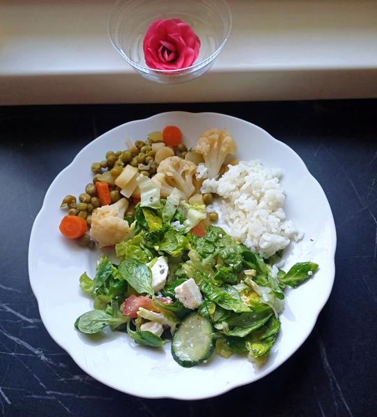 Zeleninova polievka, sampinonovy stroganov s ryzou a zakusok falosny kremes.