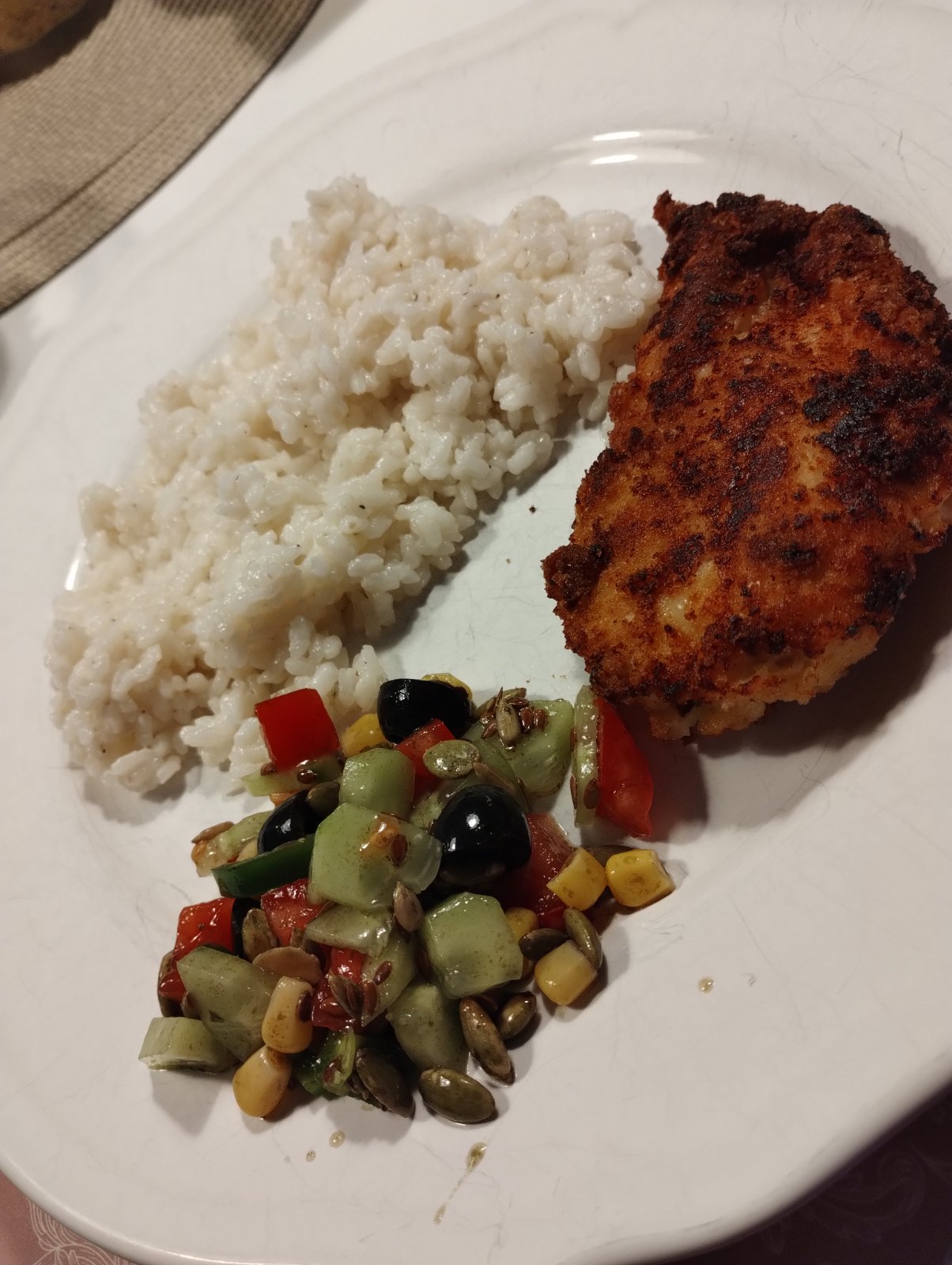 Rezne marinované v kyslej smotane, ryža, miešaný šalát. Švédske škoricove uzliky ku káve.