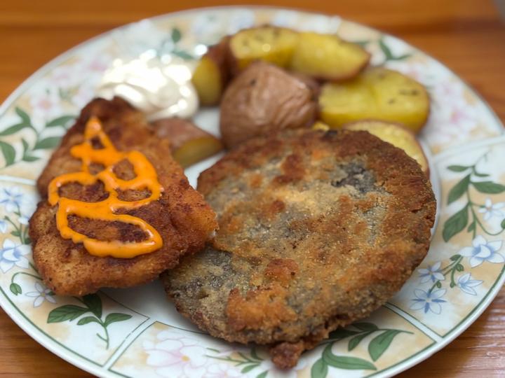 Bravčová panenka, pol na pol hranolky a rýža + opečená slaninka😋