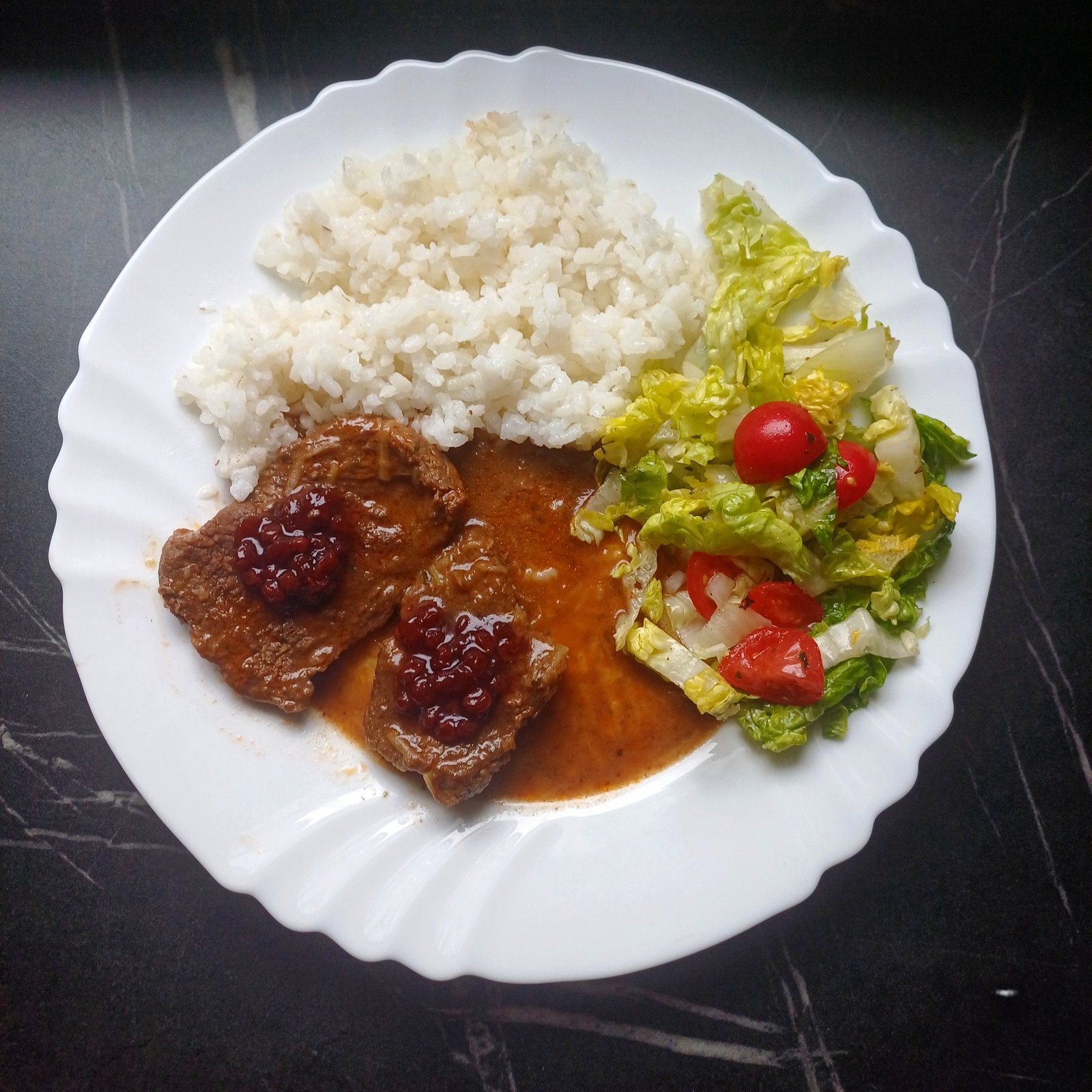 Hovädzí vývar, dusené jelenie stehno s brusnicami, ryža, šalát.